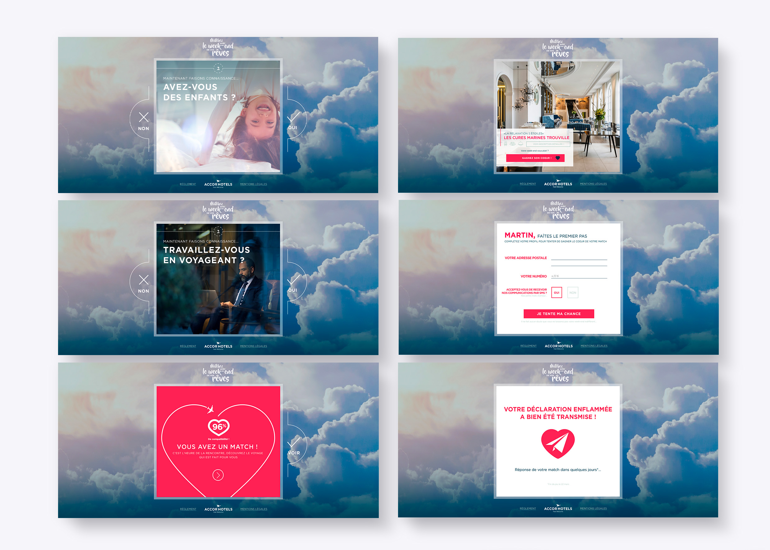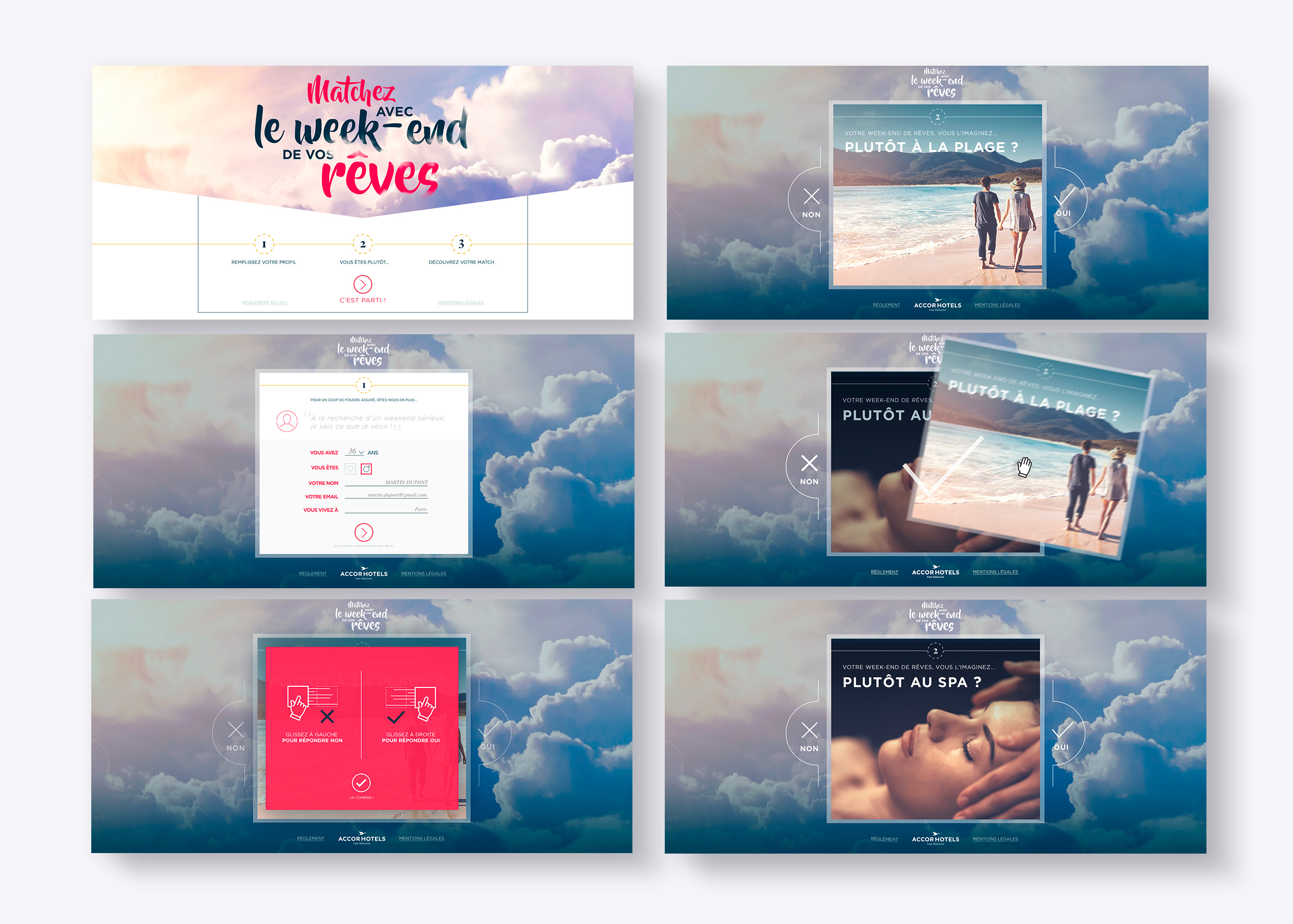 Pour répondre au besoin du groupe AccorHotels de mieux comprendre les attentes de ses clients, j’ai conçu un jeu interactif ludique et engageant. Inspiré des principes des applications de rencontre, ce jeu invite les participants à swiper leurs préférences à travers des questions telles que : « Êtes-vous plutôt plage ou spa ? » ou « Voyagez-vous avec des enfants ? ». À la clé, un week-end de rêve à gagner, transformant un simple questionnaire en une expérience utilisateur captivante, tout en permettant à AccorHotels de mieux connaître les envies de ses consommateurs.