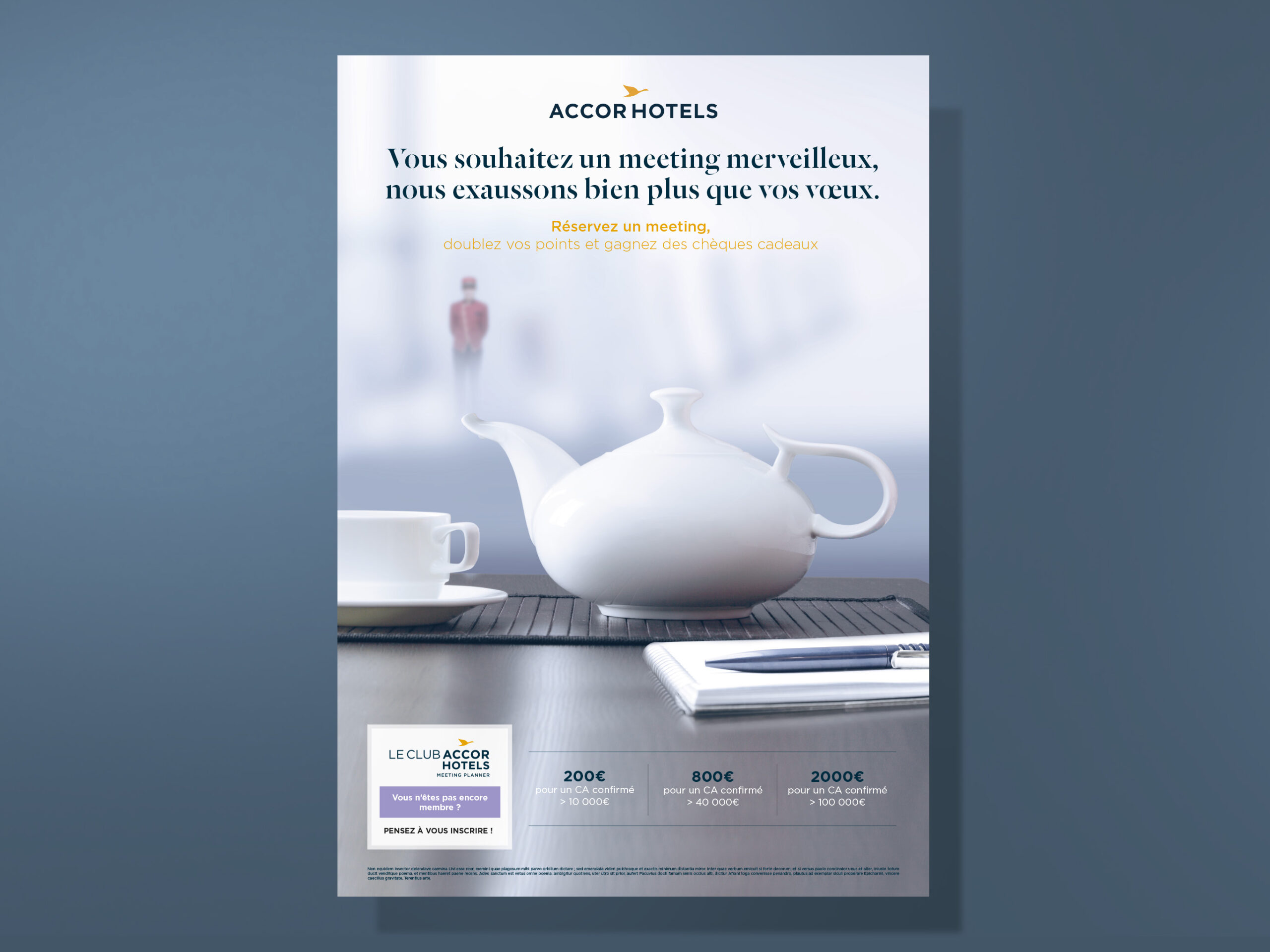 Pour promouvoir la réservation de salles de réunion au sein du groupe AccorHotels, j’ai imaginé une campagne inspirée des contes des Mille et Une Nuits. L’annonce mettait en scène un génie surgissant d’une théière, incarnant des rencontres extraordinaires et pleins de possibilités. Une approche créative et onirique, conçue pour captiver l’attention des lecteurs et refléter l’originalité et la qualité des services d’AccorHotels.