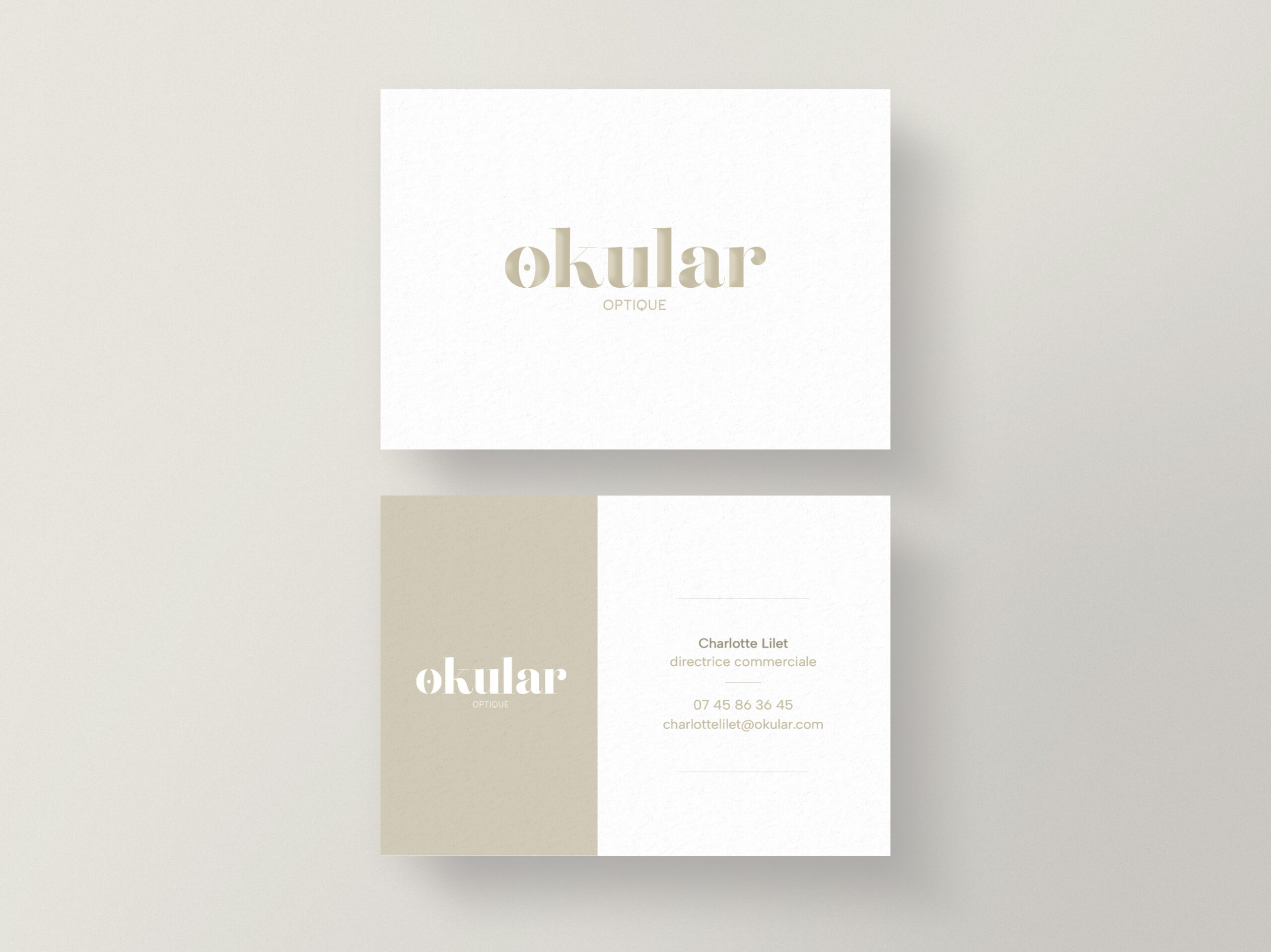 Conception des cartes de visite en accord avec la charte graphique de la marque, assurant une continuité visuelle et une reconnaissance immédiate de l’identité d’Okular.