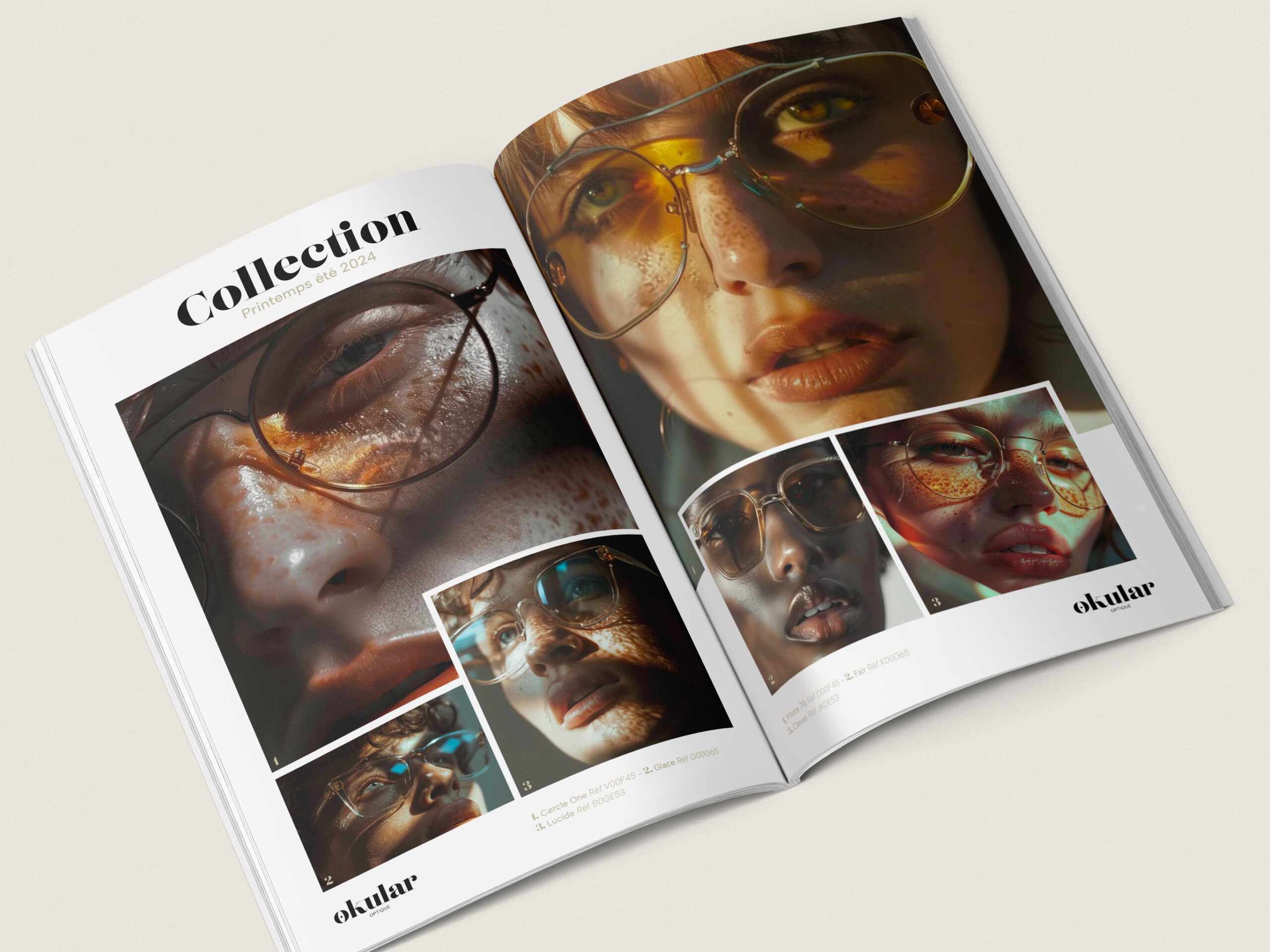 Réalisation d’une brochure présentant la collection printemps-été 2024, conçue comme un véritable magazine de mode. Ce support de communication, à la fois informatif et esthétique, met en lumière les lunettes de la nouvelle collection.