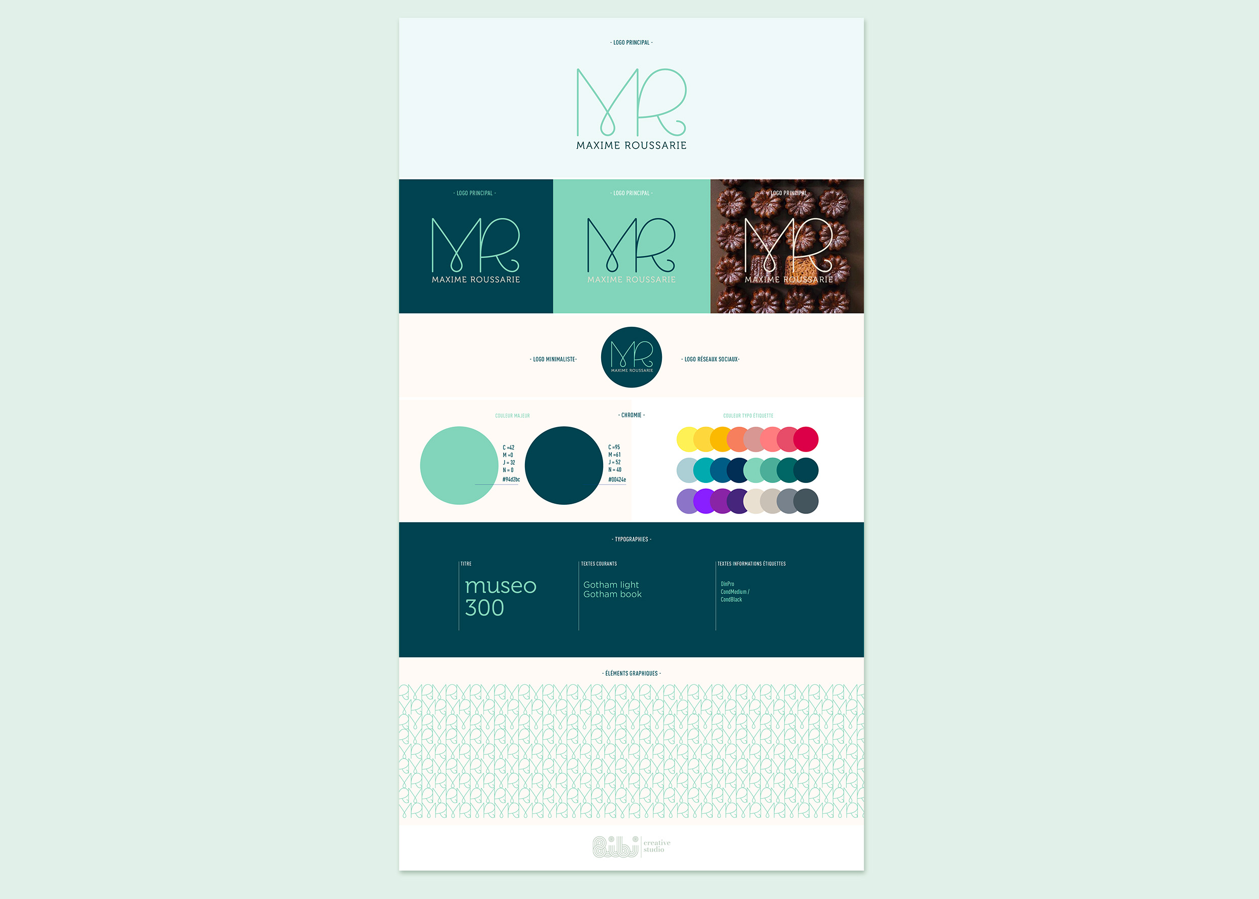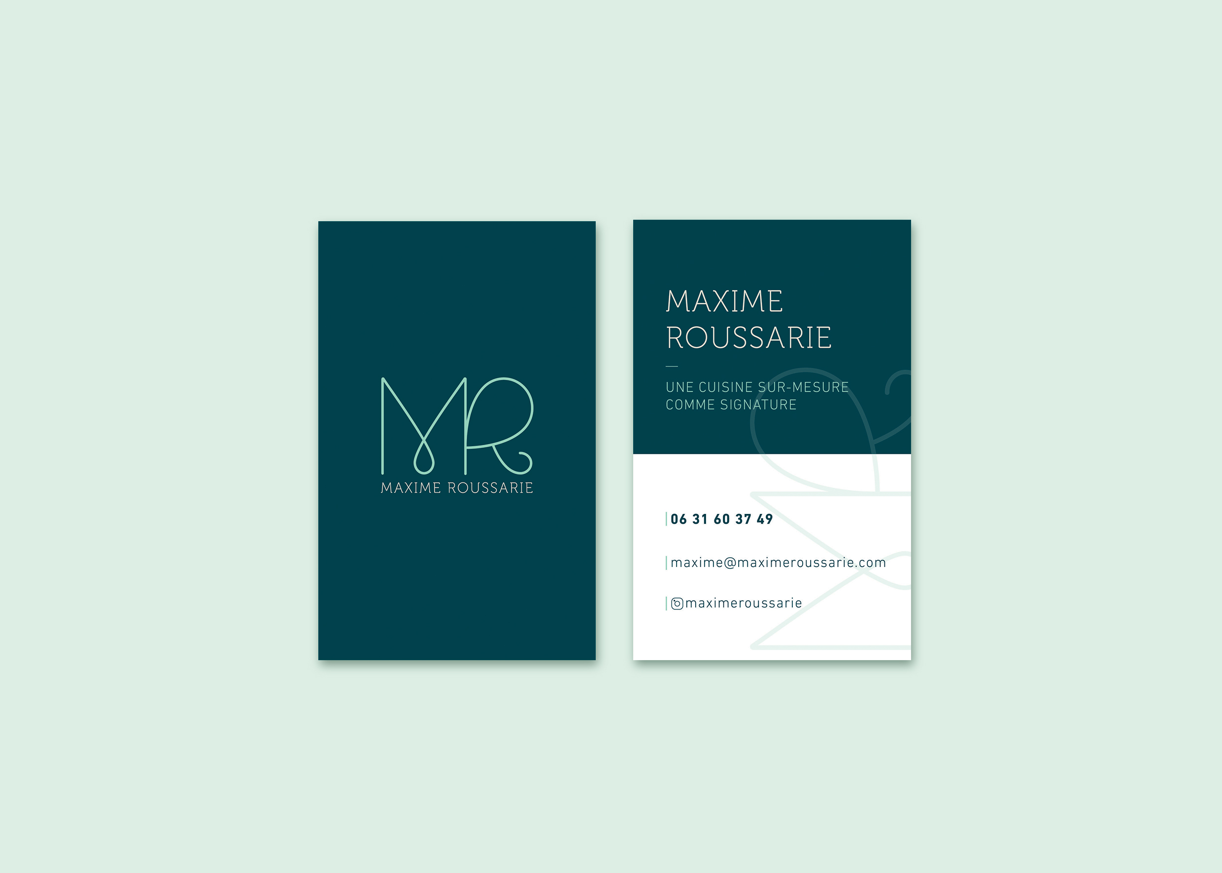 Pour Maxime Roussarie, chef et traiteur haut de gamme, une identité visuelle complète a été développée, reflétant son élégance et son lien avec le végétal. Le logo, aux courbes organiques, symbolise l’engagement envers des ingrédients frais et naturels.